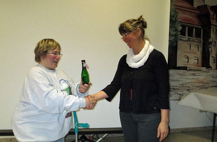 Frau Römer bedankt sich bei Anke Poser mit einem Picolo und VdK Kuli für den interessanten Vortrag.