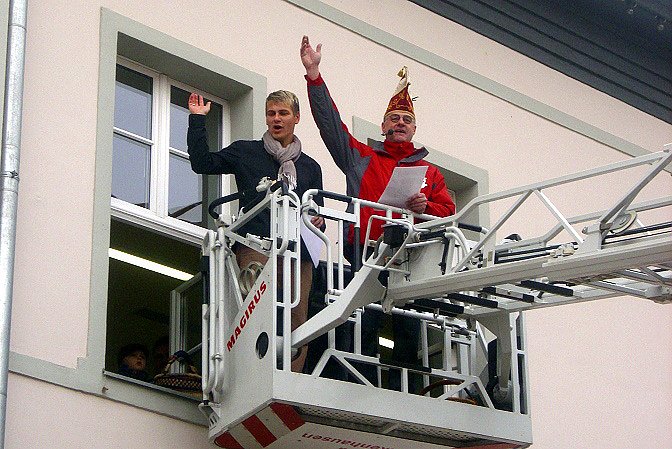 Traditionsgemäß erfolgt der Anmarsch zum Rathaus vom Thüringer Hof aus. Der Sturm des Rathauses erfolgt über die Feuerwehrleiter, wo sich die beiden Kontrahenten einen humorvollen Schlagabtausch liefern.