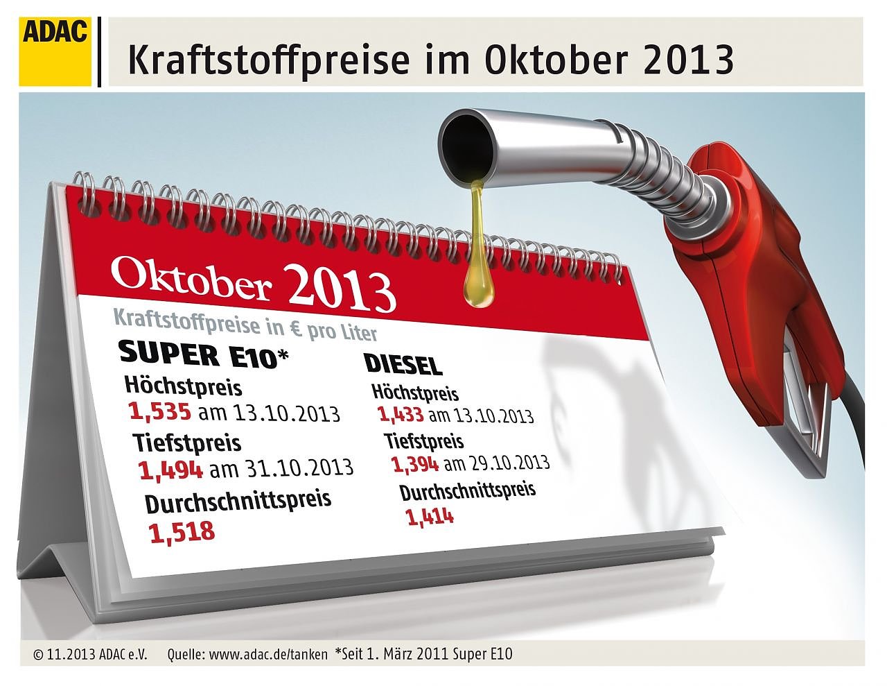 Der Benzinpreis war im Oktober 2013 so niedrig wie in keinem anderen Monat des laufenden Jahres. Wie die aktuelle Auswertung der ADAC Kraftstoffpreisdatenbank zeigt, mussten die Autofahrer für einen Liter Super E10 im Monatsdurchschnitt 1,518 Euro bezahlen. Das sind 4,5 Cent weniger als im September...