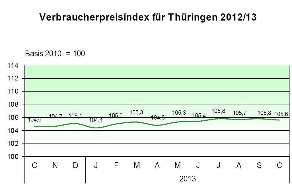 Nach Mitteilung des Thüringer Landesamtes für Statistik sank der Verbraucherpreisindex im Monat Oktober gegenüber dem Vormonat September um 0,2 Prozent. Er fiel auf einen Indexstand von 105,6 Prozent (Basis 2010=100). Die Jahresteuerungsrate lag im Oktober 2013 um 0,1 Prozent nied-riger als im Monat September.