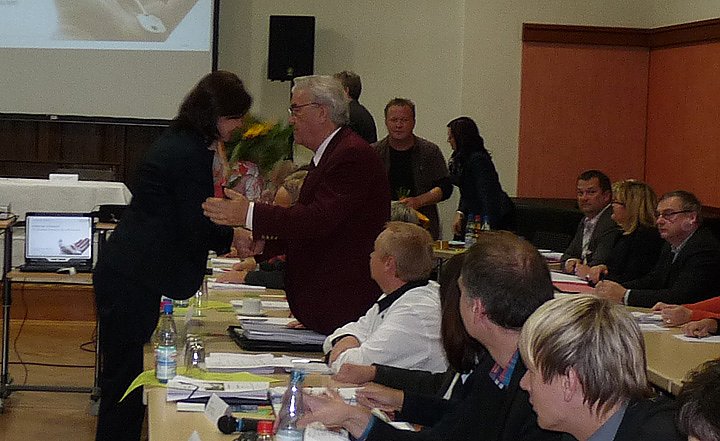 Autor: khhLandrätin Antje Hochwind gratulierte Rolf-Dieter Reiber (DIE LINKE) zum heutigen Geburtstag. Fraktionschef Torsten Blümel von der Linken schloss sich an.