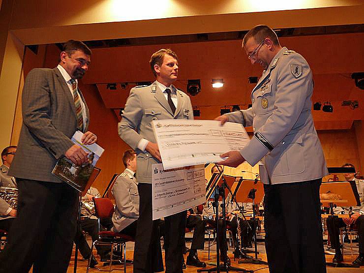 Und auch dieses Jahr erbrachte das Konzert eine stolze Summe. Als erster übergab Oberstleutnant Kankeleit einen Scheck über 1.665 Euro an das Soldatenhilfswerk der Bundeswehr. Den Scheck übernahm stellvertretend Oberstabsfeldwebel Krupp. Kameradschaftshilfe ist das Leitbild des Soldatenhilfswerkes der Bundeswehr e.V. Seit über 50 Jahren leistet es in diesem Sinne schnelle und unbürokratische Hilfe für Soldatinnen und Soldaten, die unverschuldet in Not geraten sind. Dieses Geld wird durch Spenden oder solche Konzerte aufgebracht.