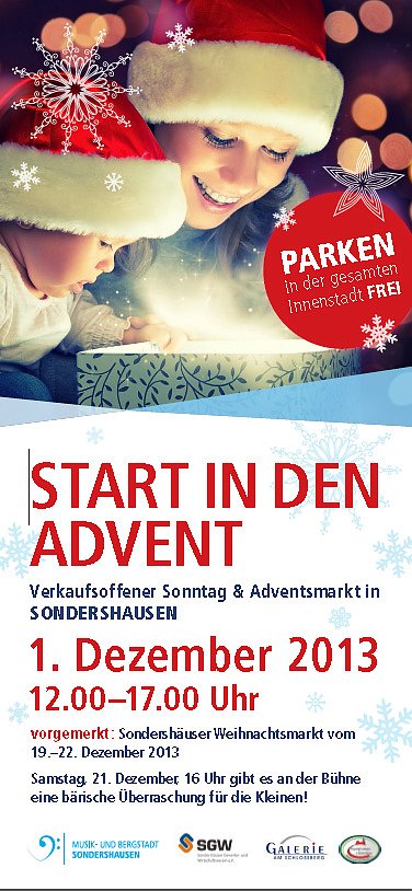 Unter dem Motto Start in den Advent findet am Sonntag, dem 1. Dezember 2013 erstmalig in der Zeit von 12.00 bis 17.00 Uhr ein verkaufsoffener Sonntag mit einem Adventsmarkt statt. Dieser wird in der gesamten Fußgängerzone sowie Johann-Karl-Wezel-Straße durchgeführt. Über 40 ambulante Händler haben ihr Kommen zugesagt. Das Angebot reicht von weihnachtstypischen Geschenkartikeln, Holzspielzeug, Mineralien, Kerzen, Spezialitäten aus Süd-Kreta Fensterdekoration, Modeschmuck bis hin zu warmen Wintersocken.