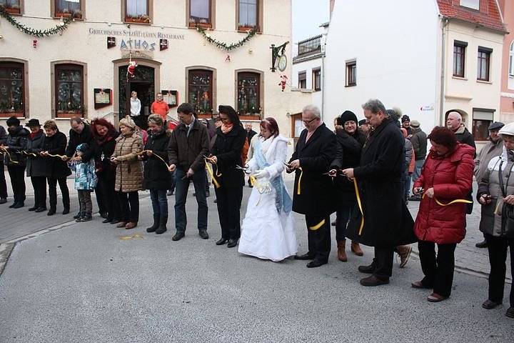 U.a. flankiert von Landrätin Antje Hochwind (SPD) und Arterns Bürgermeister Wolfgang Koenen (Die Linke) gaben heute die Salzprinzessin von Artern und viele weitere Bürger in der Salinestadtden sanierte Boulevard wieder frei.