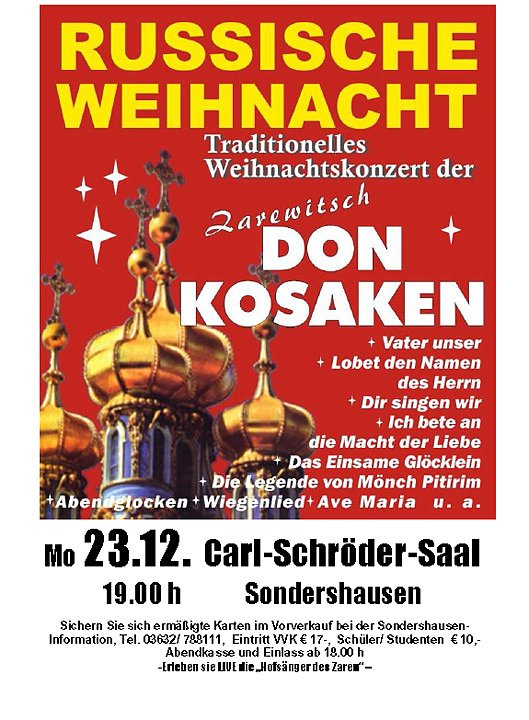 Traditionelles Weihnachtskonzert der ZAREWITSCH DON KOSAKEN in Sondershausen. Und eine kleine Weihnachtsüberraschung gibt es auch, wir verlosen 3x2 Eintrittskarten für das Konzert...