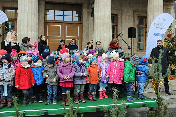 Traditionell gaben die Kinder der Kitas den offiziellen Startschuss des Weihnachtsmarkts mit ihem Gesang. Wenn kn sich nicht geirrt hat, bestand der Chor aus Kindern der Kitas, Arche Noah Stockhausen, Käferland Franuberg, den Bebraer Spatzen und der Käthe-Kollwitz.