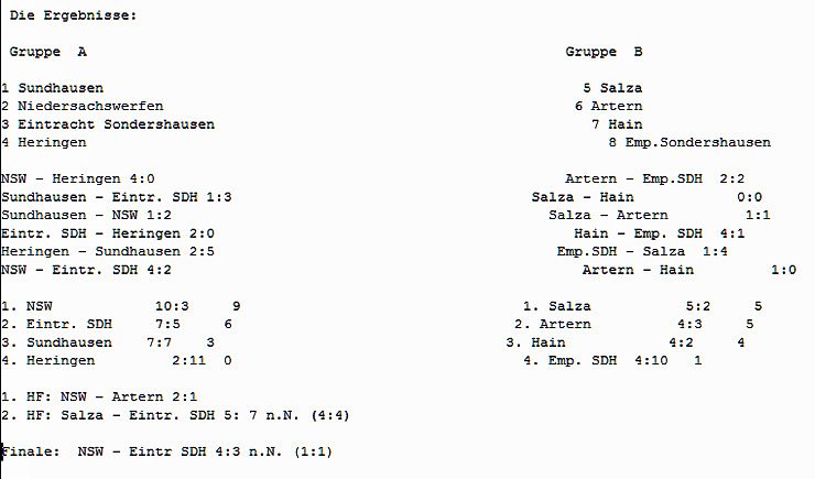 Damit ergibt sich folgender Endstand: 1. Niedersachswerfen, 2. Eintracht Sondershausen, 3. Salza, 4. Artern, 5. Sundhausen, 6. Hain, 7. Heringen, 8. Empor Sondershausen.