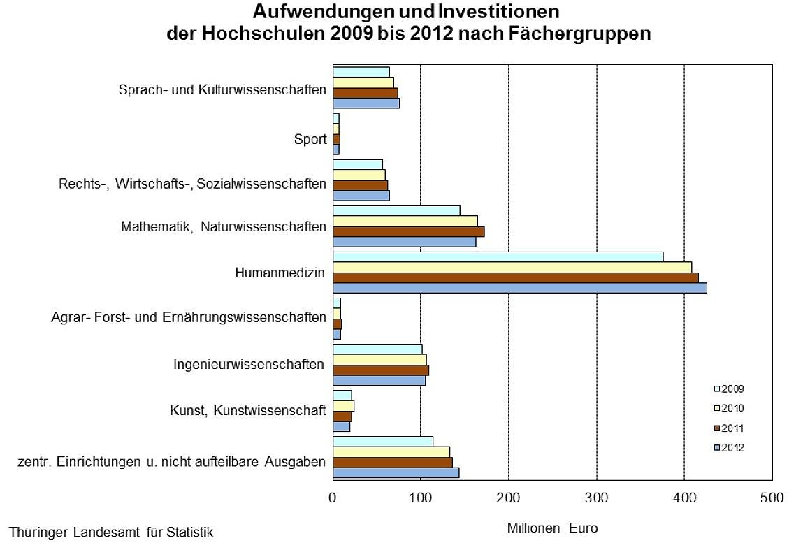 Die Fächergruppen Humanmedizin (426 Millionen Euro), Mathematik, Naturwissenschaften (162 Millionen Euro), Ingenieurwissenschaften (105 Millionen Euro) und Sprach- und Kulturwissenschaften (76 Millionen Euro) waren am stärksten an den Aufwendungen beteiligt. 648 Millionen Euro bzw. rund 64 Prozent der gesamten Aufwendungen entfielen auf Personalaufwendungen. Sie stiegen gegenüber 2011 um 2,3 Prozent. Das Investitionsvolumen verringerte sich um 12,1 Prozent und betrug 92 Millionen Euro. Damit wurde nur jeder elfte Euro investiert.
