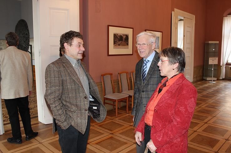 Noch mehr Gäste kamen aber aus der Region der Verwaltungsgemeinschaft An der Schmücke. Hier Timm Kregel (li.) im Gespräch mit der Familie von Bismarck aus Braunsroda. Auch Vizelandrat Holger Häßler, so wie der Bürgermeister von Gorsleben, Dietmar Strickrodt (Die Linke) ließe es sich nicht nehmen, seinen wohl bekanntesten Bürger bei dessen Ausstellungseröffnung zu begrüßen. Auch Landtagsmitglied Dorothea Marx (SPD) war interessierte Besucherin der Ausstellung.