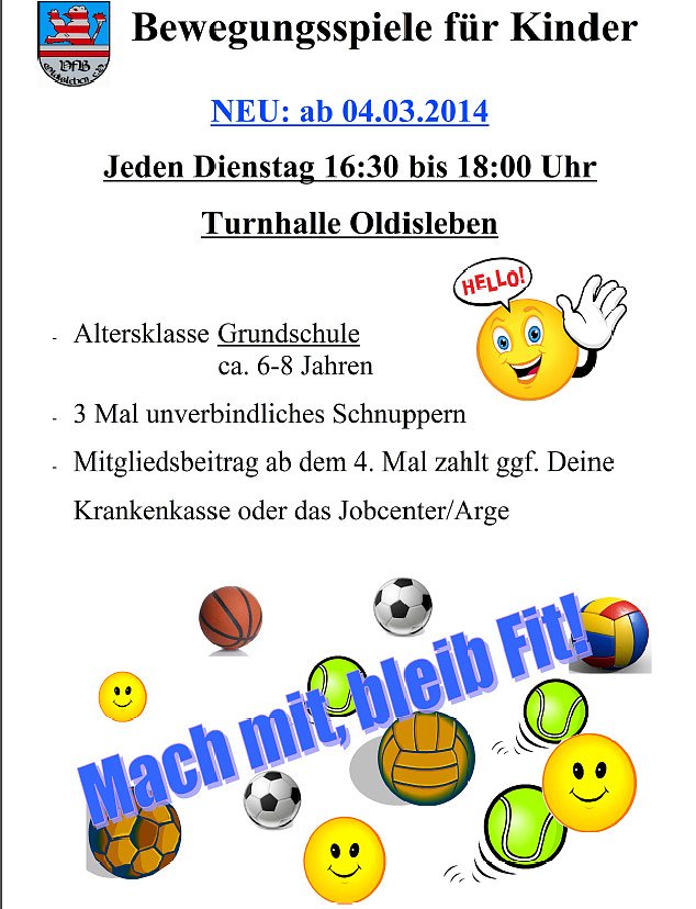 Was Montags für das Kindergartenalter super angenommen wurde und wird, möchte der Sportverein ab dem Dienstag 04.03.2014 auch für Mädchen und Jungen im Beginn der Grundschule anbieten.
