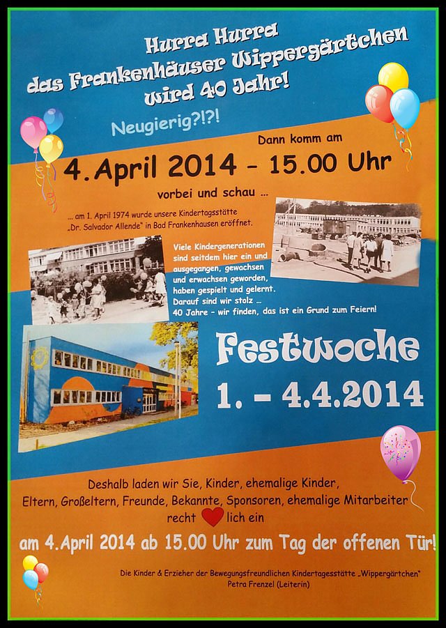 Hurra Hurra die Bad Frankenhäuser Kindertagesstätte"Wippergärtchen" wird 40 Jahr. Da feiert man gleich mt einer Festwoche. Wann das Ganze Startet, gibt e hier...