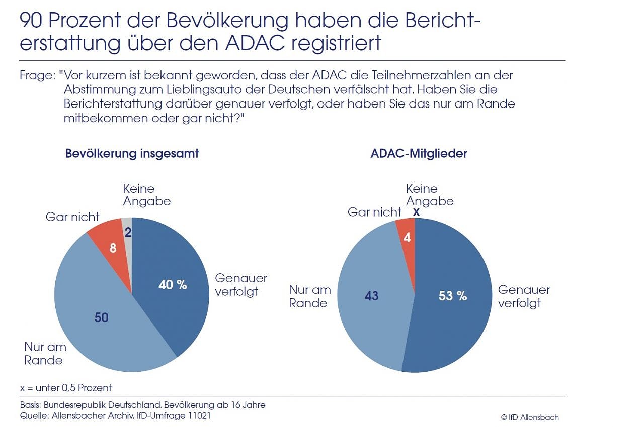 Von denjenigen, die die Berichterstattung näher verfolgt haben, haben 70 Prozent ihre Einstellung zum ADAC geändert; von denjenigen, die die Berichte nur am Rande registriert haben, sind es 44 Prozent. Der Stimmungswandel betrifft dabei vor allem das Vertrauen in die ADAC-Testergebnisse, während die Meinung über den ADAC als Pannendienst, also die Keimzelle und den ursprünglichen Zweck des ADAC, weitgehend unverändert ist.