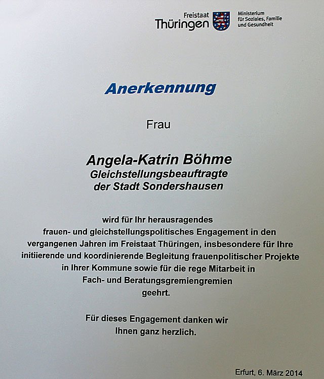 Damit würdigte man die lange jährige aktive Ausfüllung der Tätigkeit der Gleichstellungsbeauftragen der Stadt Sondershausen. Über Angela Böhme berichtete kn bereits öfter wenn es um das Thema Frauen ging, ob bei der Organisation der Frauentags feiern (letzten Montag) oder der Durchführung der Fahnenaktion vor dem Rathaus.