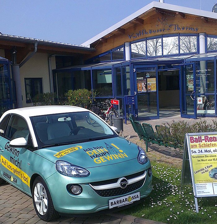 Am Samstag, den 24. Mai 2014 findet von 15 - ca. 21 Uhr das 2. Große Ballrennen auf der Festmeile zugunsten des Schiefen Turmes von Bad Frankenhausen statt, wo es dieses Jahr ein Opel Adam im Wert von 15.835,00 Euro vom Opel Autohaus Barbarossa zu gewinnen gibt.