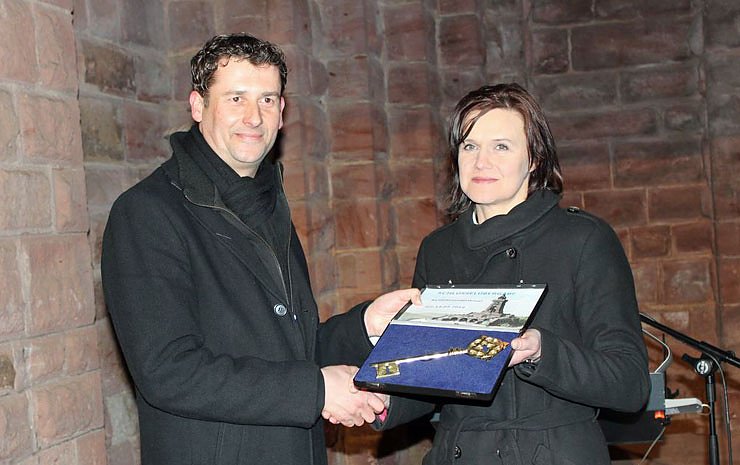 So konnte er auch guten Gewissens den symbolischen Schlüssel aus der Hand von Landrätin Antje Hochwind (SPD) übernehmen. Nur gemeinsam sind wir stark so Knorr und dankte allen Mitarbeitern für die schnelle Übernahme des Denkmals. Besonders hob er aber die Frankenhäuser Stadträte, Bürgermeister Matthias Strejc und den Betriebsleiter der Kyffhäusertherme Dieter Blumentritt hervor.