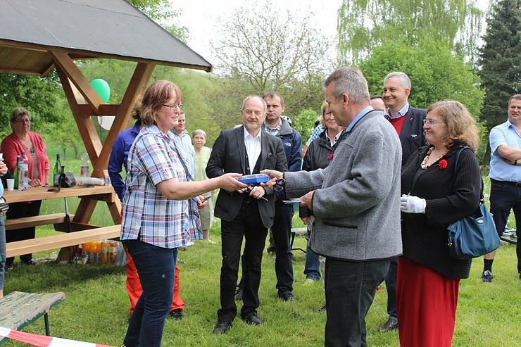 Häßler übergibt symbolisch an Tänzler ein Reparaturset, damit man in Gundersleben einem Radfahrer auch helfen könne.