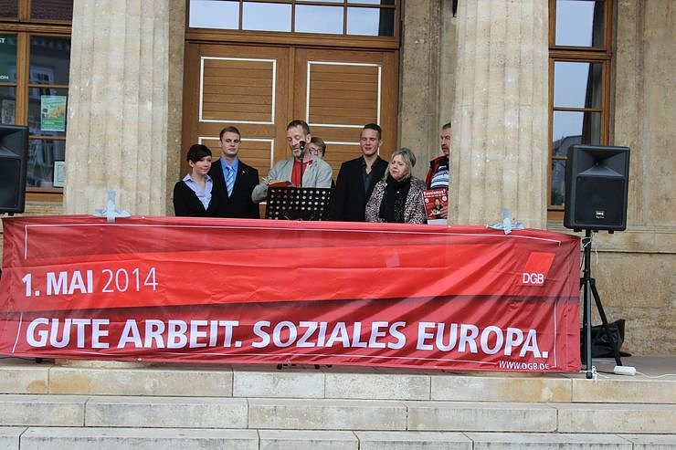 Unter dem Motto: Gute Arbeit. Soziales Europa. hatte der Vorsitzende des Kreisverbandes des DGB Kyffhäuserkreis, Reiner Sörgel die Kundgebung am Tag der Arbeit auf dem Marktplatzplatz in Sondershausen eröffnet. Hauptredner war Matthias Altmann von der Eisenbahn - und Verkehrsgewerkschaft EVG.