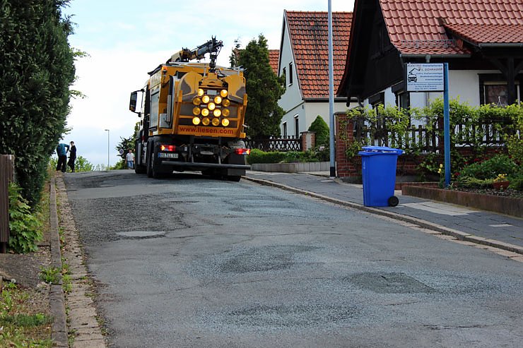Gestern war ein Reparaturfahrzeug unterwegs, dass an der Vorderseite einen Ausleger mit Sprühkopf hat und die Löcher mit Aspalt füllt und danach gleich mit Rollsplitt abdeckt. Langwierige Straßensperren waren nicht notwendig, wie ein Leser schrieb.