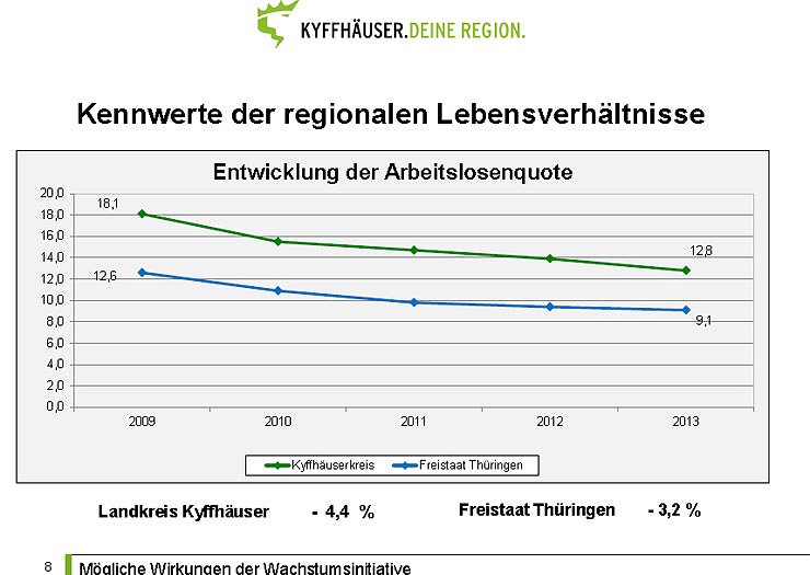 Trotz dieses positiven Trends darf jedoch nicht verkannt werden, dass der Kyffhäuserkreis im Vergleich zu anderen Regionen in Thüringen und Deutschland noch immer Defizite aufweist. Deshalb ist eine stringente Fortführung der Wachstumsinitiative dringend erforderlich.