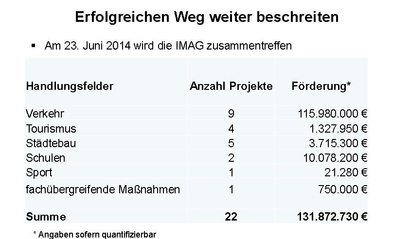 Dort sollen eine ganze Reihe Projekte auf den Tisch kommen. Schwerpunkt soll dabei der Verkehr werden, wie man an den Zahlen unschwer erkennen kann.