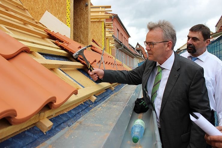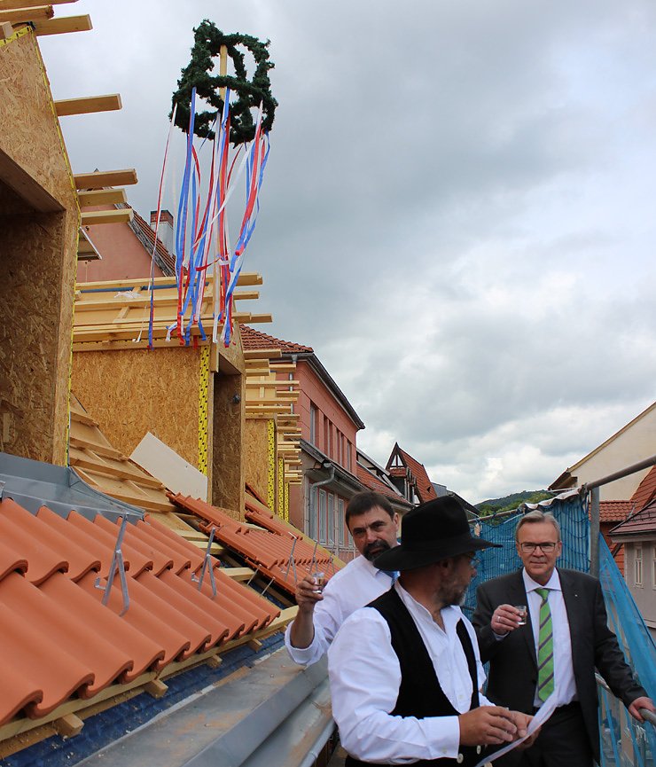 Zimmermann Ralf Huke sprach im Beisein von Sondershausens Bürgermeister Joachim Kreyer (CDU) und Geschäftsführer Eckhard Wehmeier von der städtischen Wippertal den Richtspruch und den obligatorischen Klaren, damit der Bau auch gelinge. Für das Richtfest war es höchste Zeit, denn die Dachdecker drängen schon nach und legten die ersten Dachpfannen aus.