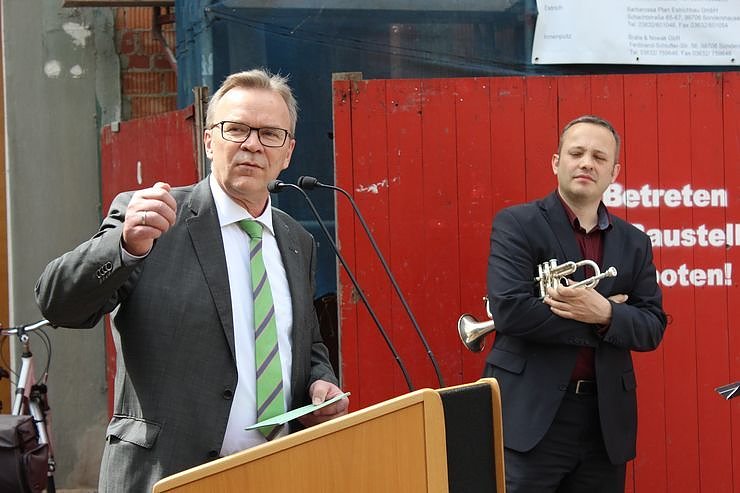 Autor: khhSeit 2009 beschäftigte sich die "Wippertal" WBG mbH intensiv mit dem Bauvorhaben. Planungen und Abstimmungen mit dem Landesamt für Denkmalschutz und dem Ministerium für Bau, Landesentwicklung und Verkehr wurden zielführend durchgeführt. Und heute wurde mit dem Richtfest ein wichtiger Schritt vollzogen. Und dieser begann mit der einleitenden Musik von Matthias Deichstetter, dem Leiter der Sondershäuser Musikschule Carl-Schroeder-Konservatorium.