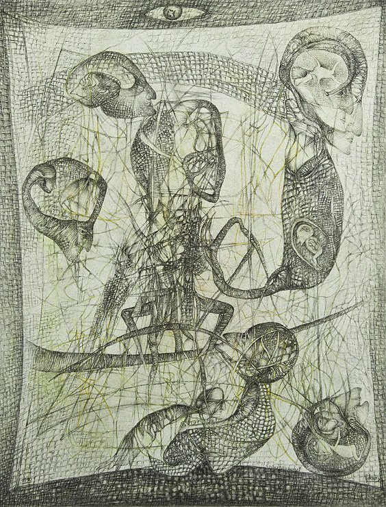 Innenschauen an eine düstere Kindheit, an Krieg und Krankheit gebären mit äußerst sensibel geführtem Stift ein unentwirrbares Geflecht aus feinsten Linien und Schraffuren, das für sich alleine gesehen abstrakt zu sein scheint, im Zusammenspiel aller Geäste jedoch organische Gewebe entstehen lässt, die Leben atmen. Amorphe Kreaturen entsteigen der Dunkelheit des Seins und bezwingen die Dämonen der Vergangenheit. Es ist ein schmerzhafter, aber dennoch reinigender Prozess des Bezeichnens einer unaussprechlichen Wahrheit, die die Seele erdrückt.