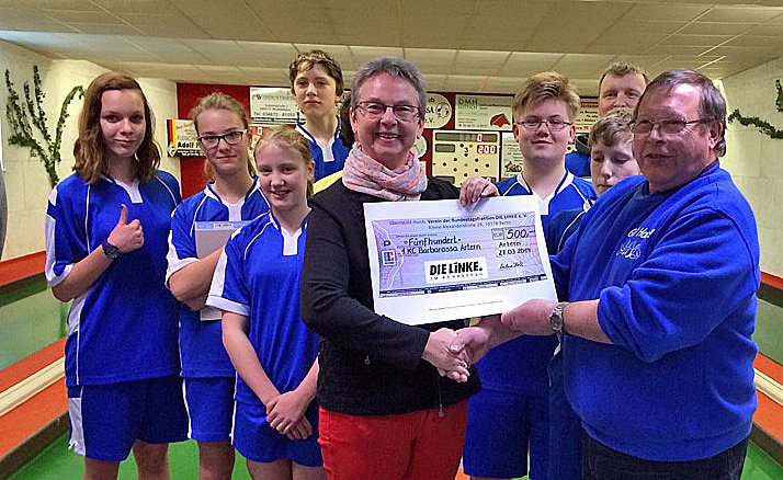 Für diese Unterstützung gewann der Verein die Bundestagsabgeordnete Kersten Steinke. Sie besuchte die Kinder und Jugendlichen in ihrer Trainingsstunde und übergab einen Scheck über 500 €. Diese nutzten dabei gleich die Gelegenheit, die Bundestagsabgeordnete in einer Gesprächsrunde über die Arbeit im Bundestag auszufragen.