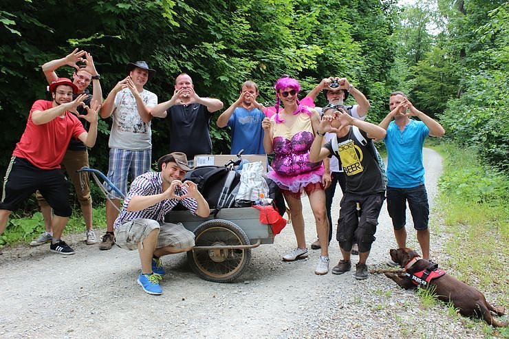 Nach dem Besuch des Possens und seiner Wander- und Radwanderwege traf der Ortswegewart diese lustige Truppe auf Junggesellenabschiedstour beim Anmarsch auf den Possen.