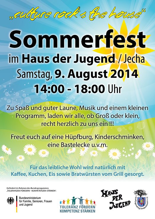 Am 09.08.2014 von 14:00 - 18:00 Uhrfindet in Haus der Jugend in Jecha das diesjährigen Sommerfest statt.