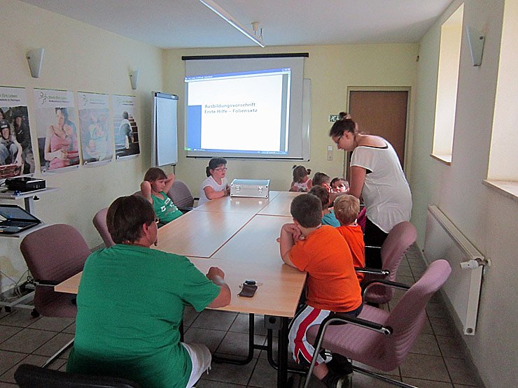Anschaulich mit Hilfe von Folien werden den kleinen Schwimmern die Grundregeln beim Baden erläutert. In Anwesenheit einer Rettungsschwimmerin werden die jüngsten Schwimmer unterrichtet bevor es nach Oldisleben ins Freibad geht.