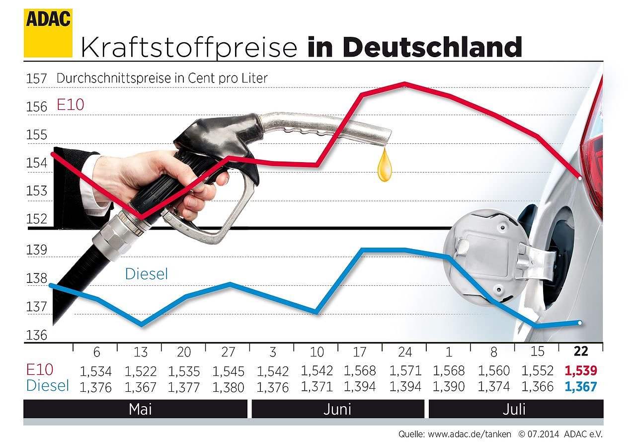 ein Liter Super E10 derzeit im bundesweiten Mittel 1,539 Euro. Im Vergleich zur Vorwoche ist dies ein Rückgang von 1,3 Cent.