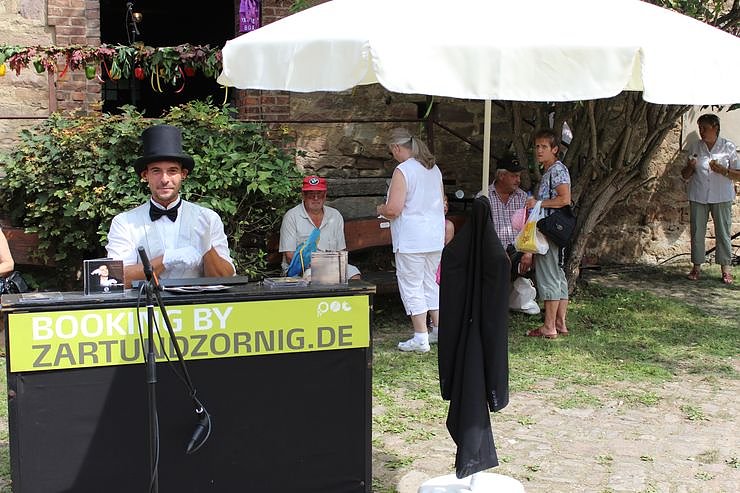 Musikalisch boten die Veranstalter dabei ein echtes Sommer-Highlight an: Christian Pommnitz von "Zart & Zornig" aus Sangerhausen spielte live am Klavier bekannte Melodien der letzten 200 Jahre. Sein Auftritt ist auf dem Regionalen Bauernmarkt bisher einmalig. Der hat echt eingeschlagen, so Hausherr Georg von Bismarck gegenüber kn.