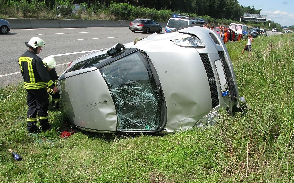 Er ist dabei sehr langsam und drängt sich dann in den laufenden Verkehr auf der Hauptfahrbahn rein. Ein bereits dort fahrender Suzuki muss bremsen und ein nach ihm fahrender VW Bus fährt auf den Suzuki auf. Der Suzuki kommt ins Schleudern, von der Fahrbahn ab und überschlägt sich in der Böschung.