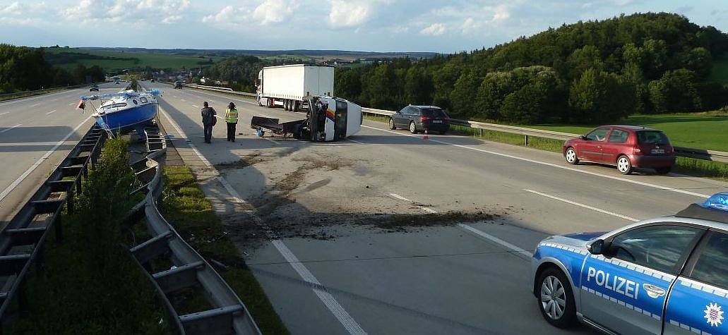 Das Wohnmobil fuhr in die Leitplanke und kippte um. Das Segelboot löste sich vom Anhänger und landete mitten auf der Leitplanke. Verletzt wurde niemand, es entstand ein Sachschaden von 11.000 Euro.