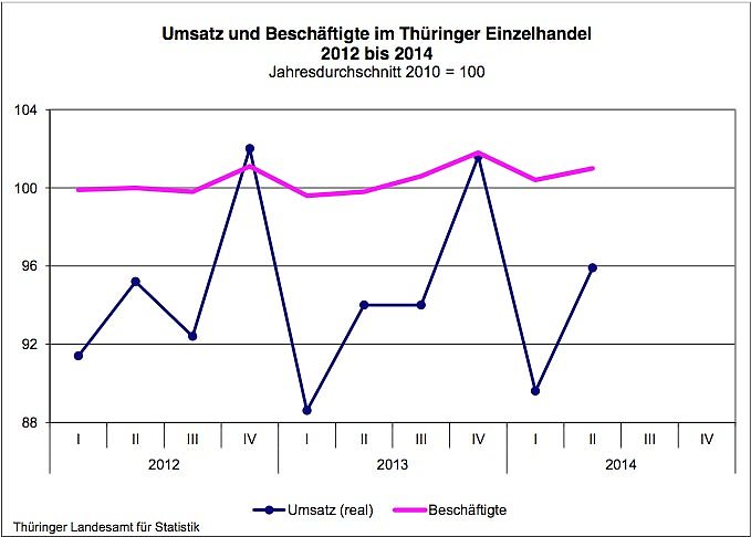 Die Thüringer Einzelhändler setzten nach vorläufigen Ergebnissen des Thüringer Landesamtes für Statistik im 1. Halbjahr 2014 real (preisbereinigt) 1,6 Prozent und nominal (zu jeweiligen Preisen) 2,4 Prozent mehr um als im gleichen Zeitraum des Vorjahres. Das Beschäftigungsniveau änderte sich im 1. Halbjahr 2014 nur unwesentlich.