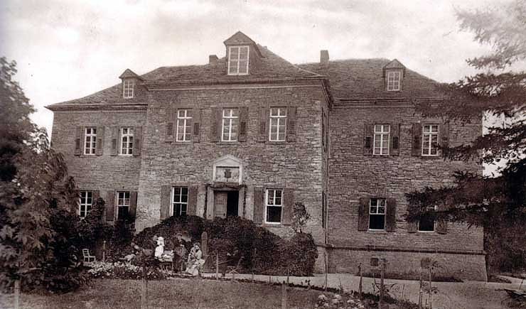 Historisches Foto von Schloss Kalbsrieth mit Wappen der Familie von Wolzogen über dem Eingangsportal.