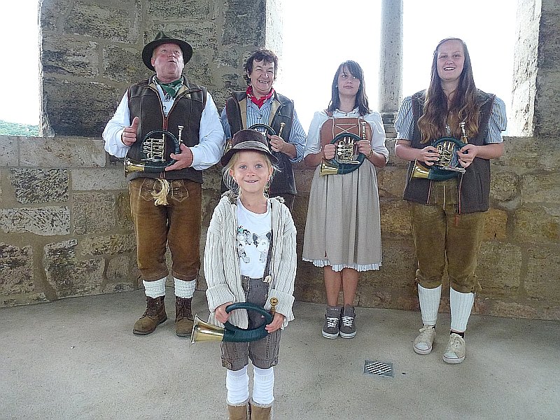 Das jüngste Mitglied eröffnete das Konzert mit 3 Tönen aus ihrem Instrument. Danach wurden einige Stücke aus dem Fenster des Turmes gespielt. Fortgesetzt wurde das Spielen auf dem Gelände des Klosters. Den Auftakt gab wieder die kleine Solistin. Nun erfolgte die Eröffnung mit einer kurzen Ansprache.