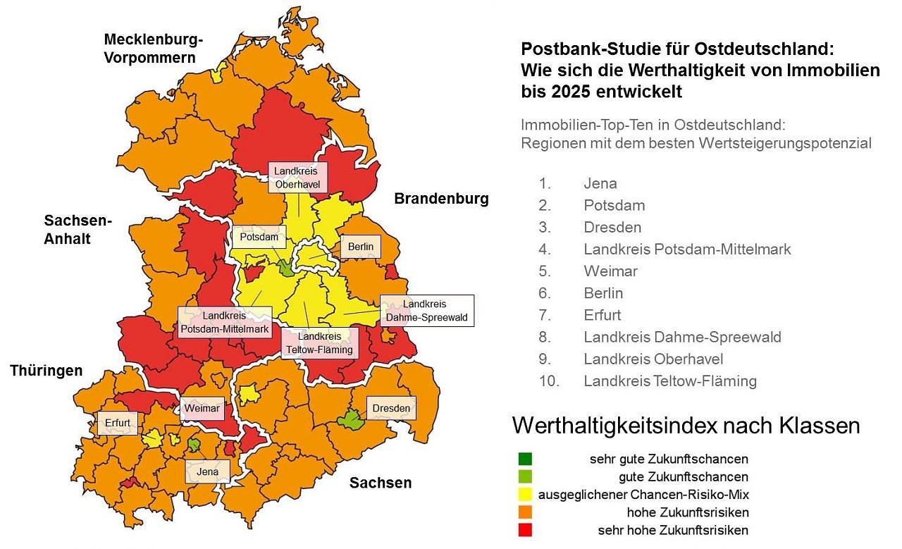 Auch Potsdam und Dresden bieten gute Chancen, dass der Wert der Immobilie bis 2025 zunimmt. Weimar, Berlin, Rostock und Leipzig versprechen zumindest stabile Wertentwicklungen. Gleiches gilt für die Landkreise Potsdam-Mittelmark, Dahme-Spreewald, Oberhavel und Teltow-Fläming, die es in die ostdeutschen Immobilien-Top-Ten schaffen. In anderen Regionen müssen Käufer schon genauer hinschauen.