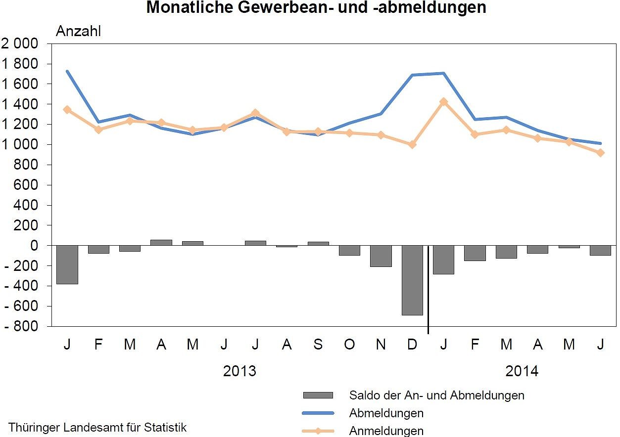 In Thüringen kamen im ersten Halbjahr 2014 auf 10 000 Einwohner 31 Gewerbeanmeldungen und 34 Gewerbeabmeldungen.Regional betrachtet, gab es jedoch erhebliche Unterschiede. Die meisten Gewerbeanmeldungen je 10 000 Einwohner wurden in den Städten Erfurt (44) und Suhl (39) sowie im Weimarer Land (35) angezeigt und die wenigsten im Altenburger Land (21), im Landkreis Hildburghausen (23) und im Kyffhäuserkreis(24).