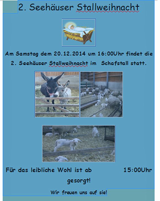 Autor: khhAm Samstag dem 20.12.2014 um 16:00 Uhr findet die 2. Seehäuser Stallweihnacht im Schafstall statt.