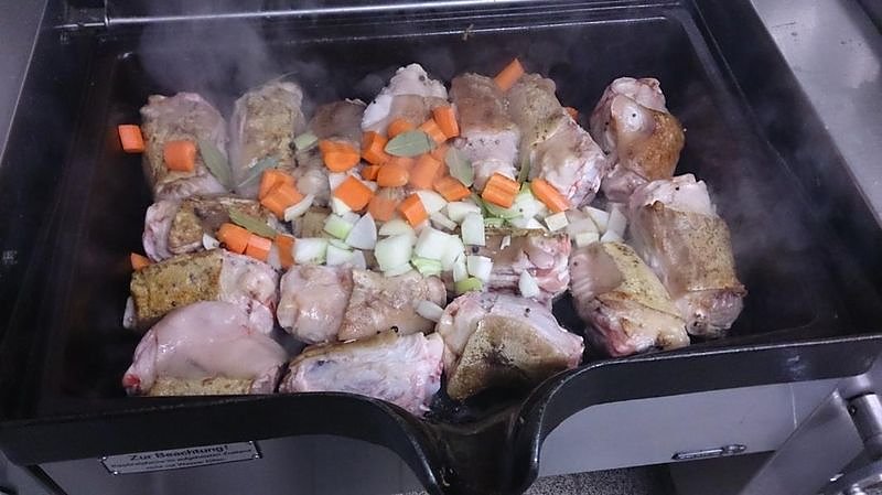 Pünktlich um 12 konnten dann die Portionen ausgeteilt werden, wobei die Eisbeine kaum Platz für die Zutaten auf den Tellern ließen. Das größte Lob für die Köche war dann, dass auf den Tellern fast nur Knochen zurück kamen. Da nicht alle Portionen ausgegeben werden mussten, wurde der Rest eingefroren und kann im nächsten Jahr nochmal angeboten werden.