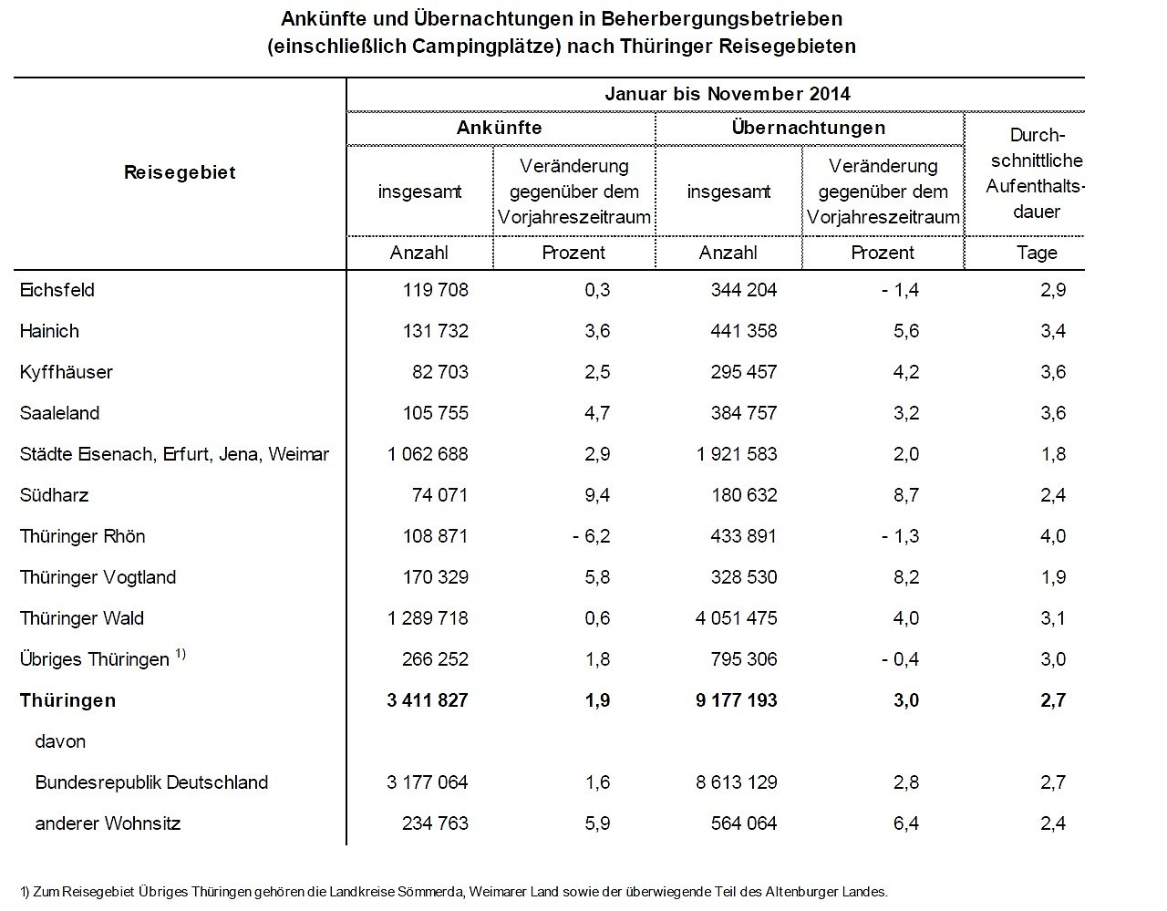 Von Januar bis November 2014 stieg die Zahl der Übernachtungen in den Thüringer Beherbergungsbetrieben mit zehn und mehr Betten und auf Campingplätzen mit mindestens zehn Stellplätzen gegenüber dem vergleichbaren Vorjahreszeitraum um drei Prozent auf 9,2 Millionen. Die Zahl der Gästeankünfte erhöhte sich im gleichen Zeitraum um 1,9 Prozent auf 3,4 Millionen...