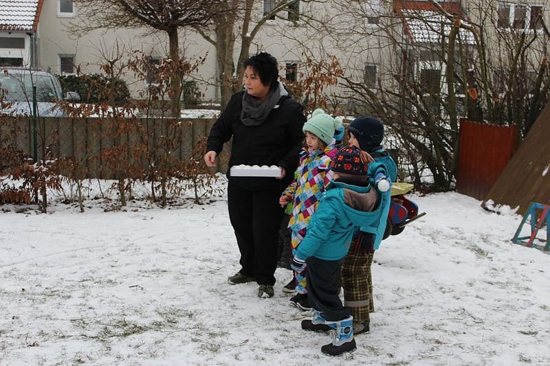 In Ermangelung eines richtigen Schneemanns wurde ein verkleideter Schneemann, genauer gesagt Schneefrau "engagiert" und mit dem Lied "Schneeflöcken, Weißröckchen" wurde Frau Holle nochmals an ihre Pflichten gegenüber den Kindern erinnert.