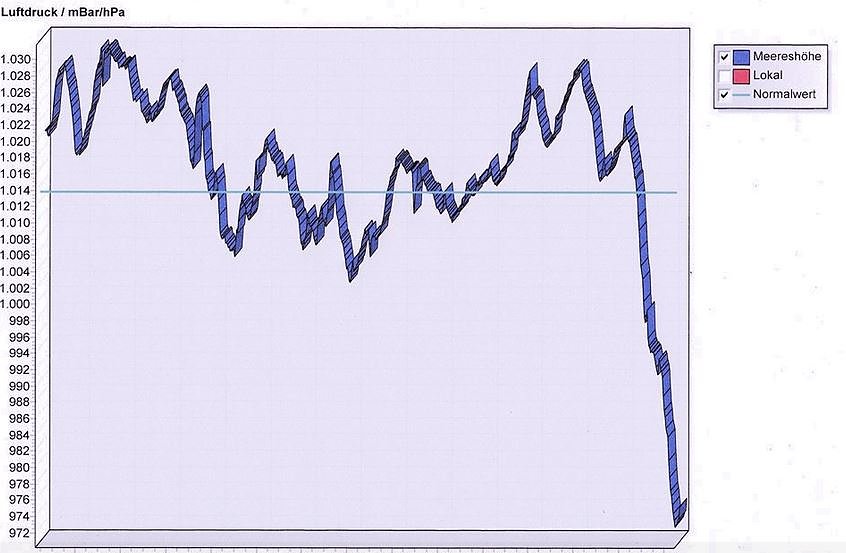 Der Luftdruck hat an meiner Wetterstation einen neuen Rekord erreicht 972.00 hPa, schreibter, aberjetzt geht's aufwärts. Der niedrigste Luftdruck in Deutschland wurde mit 954,4 hPa am 27. November 1983 in Emden gemessen.