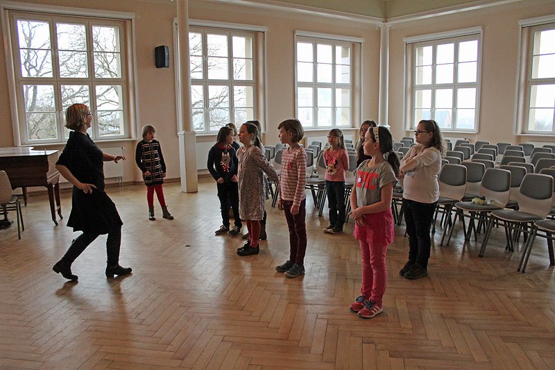 Als Vorbereitung auf die OrchesterWerkstatt am 15.4.2015 im Haus der Kunst arbeiten Konzertdramaturgin Juliane Hirschmann hier im Bild, Theaterpädagogin Daniela Zinner und Laura Wankelmut, FSJlerin im Jungen Theater am in der Sondershäuser Grundschule Käthe-Kollwitz
