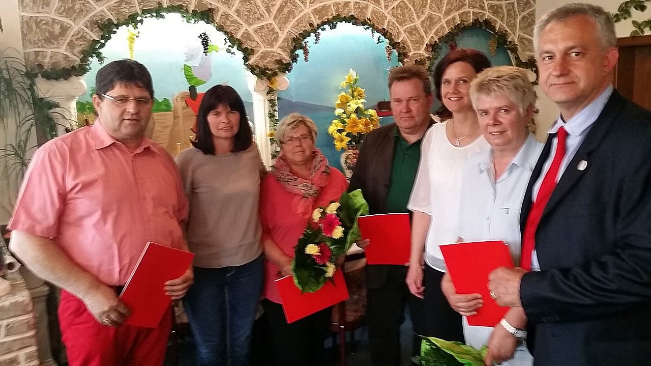 Uwe Vogt, Gisela Wegewitz und Monika Hahn durch den Ortsvereinsvorsitzenden Thomas Gehlhaar, die Kreisvorsitzende Cornelia Kraffzick, die Landrätin Antje Hochwind und den Bundestagsabgeordneten Steffen- Claudio Lemme