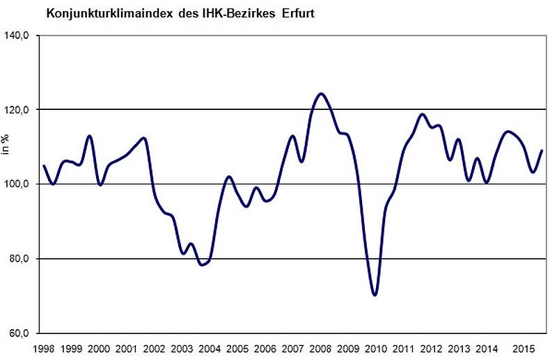 So steigt der Klimaindex, der sowohl die aktuelle wirtschaftliche Situation als auch die Erwartungen und Pläne berücksichtigt, im Vergleich zum Jahresbeginn 2015 um sechs Punkte auf 109 von 200 möglichen Prozentpunkten. Das ist das Ergebnis der jüngsten Umfrage der Industrie- und Handelskammer (IHK) Erfurt unter rund 800 Mitgliedsbetrieben.