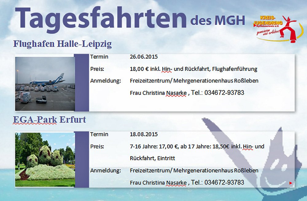Hier gibt es die geplanten Blutspendetermine und das Mehrgenerationenhaus Roßleben bietet in den Sommerferien Tagestouren an...
