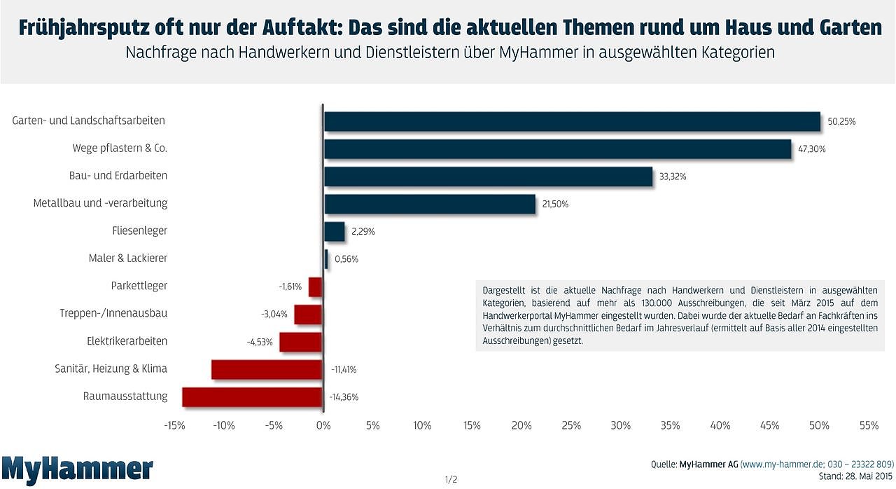 Viele Haushalte lassen es während des Frühlings nicht allein beim obligatorischen Frühjahrsputz bewenden. Welche Themen rund um Haus und Garten bei den Verbrauchern zur Zeit noch hoch im Kurs stehen, hat das Handwerkerportal MyHammer anhand der aktuellen Nachfrage nach Handwerksleistungen und handwerksnahen Dienstleistungen ausgewertet...